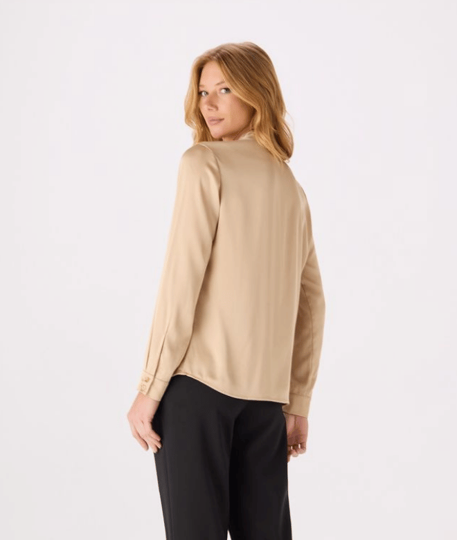 Confeccionada em tecido acetinado e leve , esta camisa combina elegância e delicadeza. Possui modelagem levemente ajustada ao corpo, mangas longas com punhos tradicionais e gola com faixa para dar laço no decote.