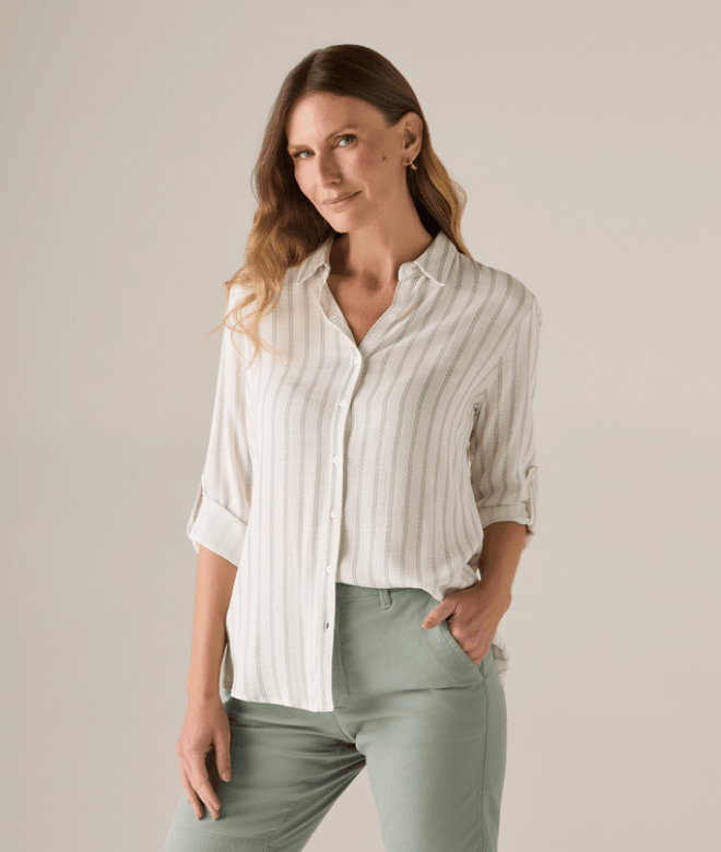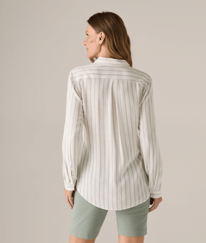 Camisa feminina de manga longa, confeccionada em tecido leve e confortável, com estampa listrada . Possui martingale nas mangas para ajuste, proporcionando versatilidade e estilo. Ideal para looks casuais ou formais.