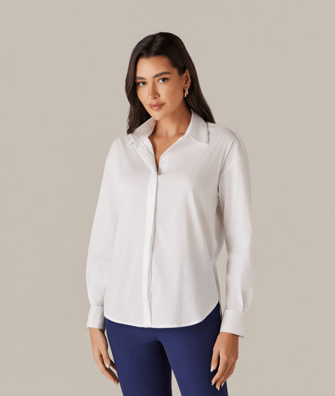 Camisa Manga Longa Vista Coberta Feminina Branca é sinônimo de estilo e conforto no guarda-roupa feminino. Com design moderno e versátil, é perfeita para diversas ocasiões. Disponível na elegante cor branco, confeccionada em algodão, garante respirabilidade, maciez e conforto durante todo o dia.