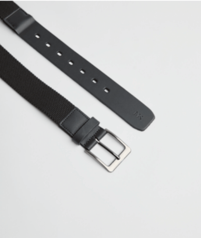 Cinto masculino casual, confeccionado em elástico preto de alta resistência com detalhes em couro, combinando conforto, estilo e facilidade de ajuste. A fivela quadrada em níquel escovado e a logo MK na mesma cor do couro reforça o visual clean e comtemporâneo.